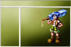 Mockup de menu avec un artwork dégueu fait à la souris qui montre le premier design d'Alex. Il a les sourcils froncés et une grosse épée, il ne plaisante pas !