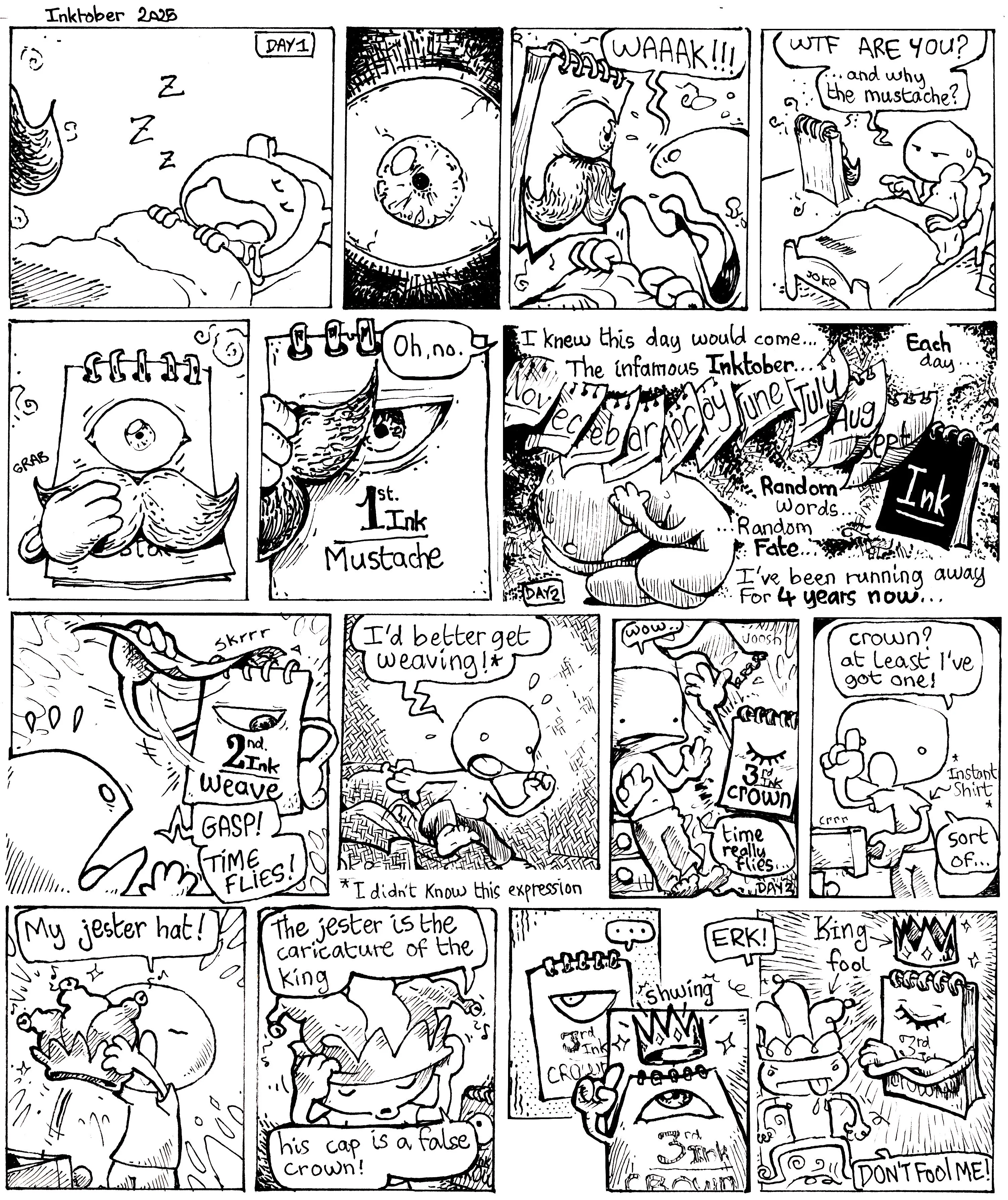 Je n'ai malheureusement fait que les trois premiers jours... L'idée de faire tout le défi en une seule BD c'était cool mais ma vie n'a pas été cool après...