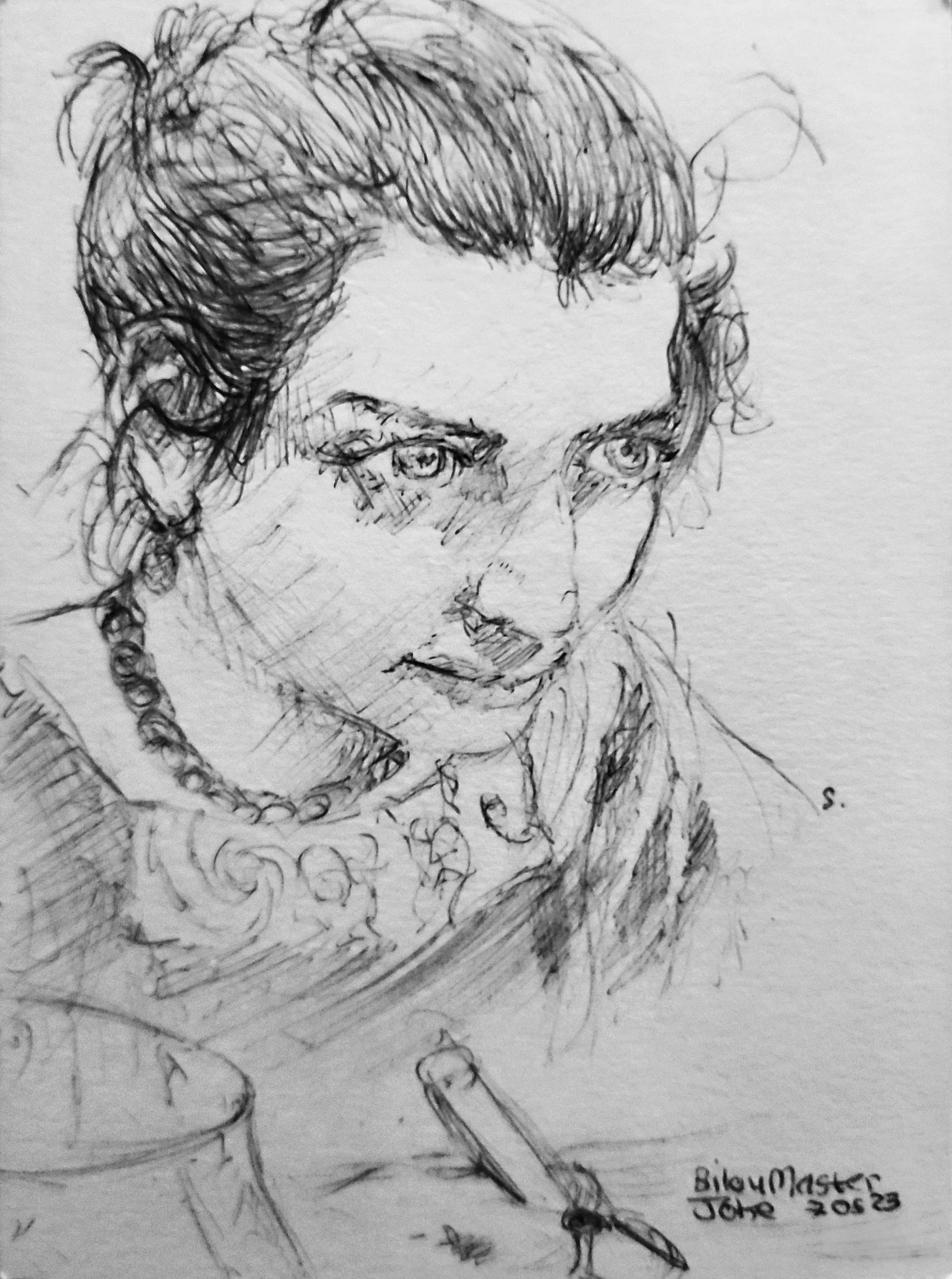 Portrait de mon amie Sarah pendant qu'elle faisait le portrait du pote à côté, pour les dessins d'obs dans les bars, elle a plus de skill que moi !